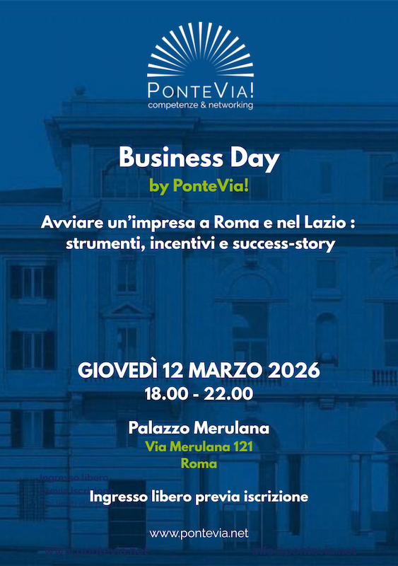 BUSINESS DAY Avviare un'impresa a Roma e nel Lazio : strumenti, incentivi e success-story GIOVEDÌ 12 MARZO 2026 al Palazzo Merulana (Via Merulana, 121) dalle 18.00 al 22.00 PonteVia! è… |